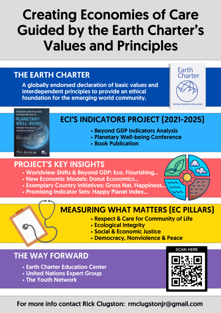 For instance, the diverse authors of the book’s 20 chapters emphasize the need to go beyond GDP growth as the central measure of a nation’s progress. They recommend adopting indicators based on the Earth Charter’s values and principles in order to create economies grounded in respect and care for the community of life.