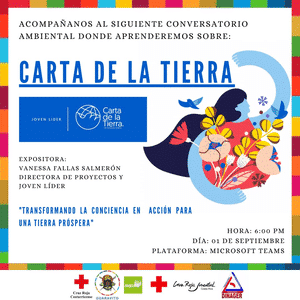 Gracias a la Coordinación Ambiental del Programa Cruz Roja Juventud y la Cruz Roja Juventud Alajuela, de la Cruz Roja Costarricense, nuestra directora de proyectos y Joven Líder de la Carta de la Tierra, Vanessa Fallas Salmeron estará compartiendo sobre la Carta de la Tierra.