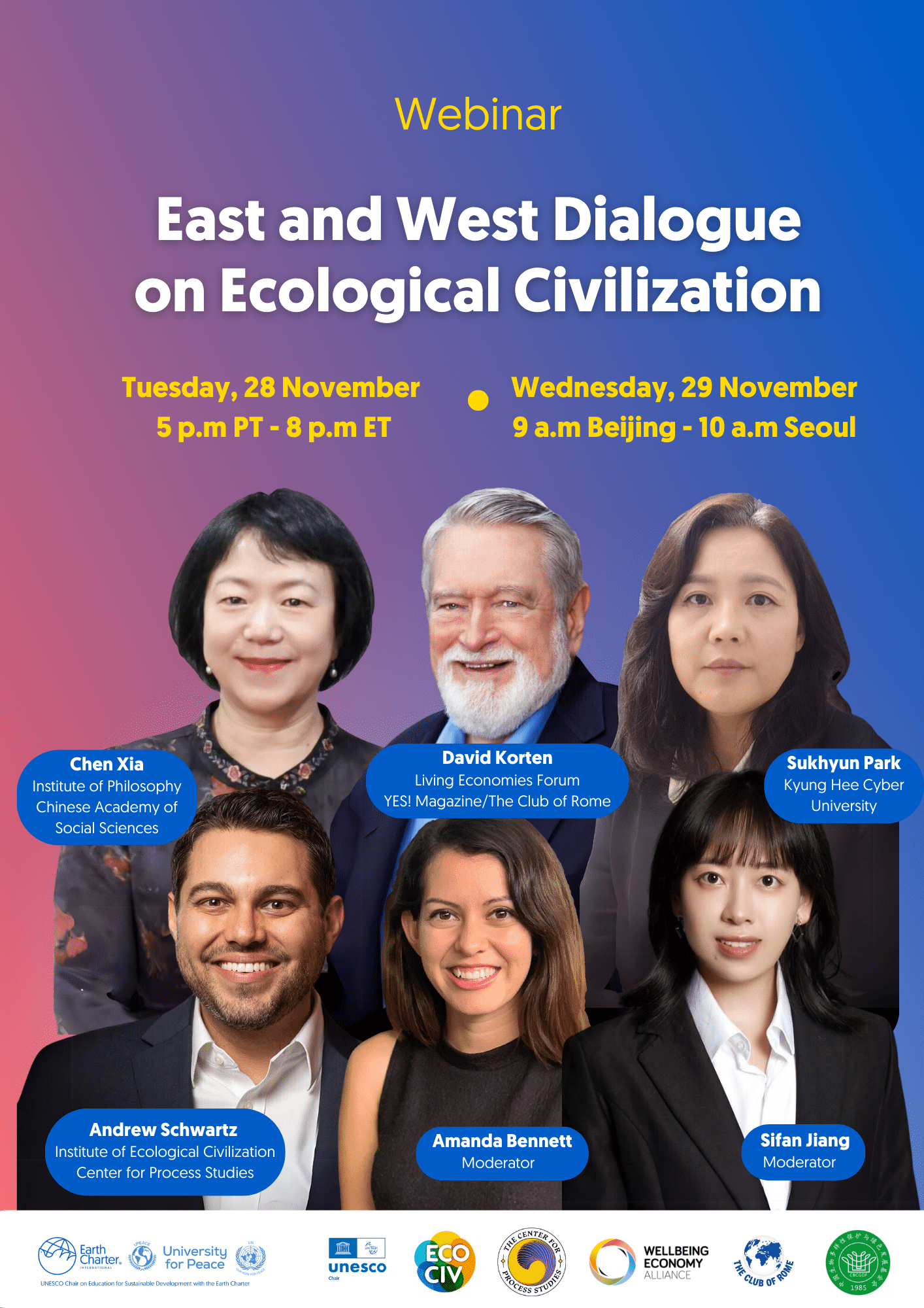 Many people around the world, including civil society, scientists, youth, and policymakers are concerned about the future of our common home and the choices we must make today to ensure that we change our course and stop contributing to our current planetary crises. To do this, all decision-makers, including governments, the private sector, and individuals must come together to achieve our global goals for sustainability, justice and peace, guided by common values. Through this intercultural dialogue, we will explore what it means to work towards an ecological civilization and what we can learn from the knowledge we have and what we have accomplished so far.
